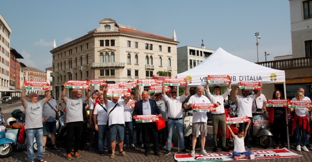 E' proprio all’inglese Geoffrey, giunto dalla località più lontana, l’assessore de Bortoli ha consegnato il gagliardetto del comune di Pordenone, quale segno di riconoscimento per la sua partecipazione al tour.